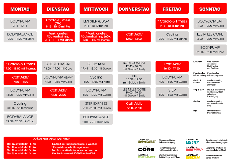 Unsere Kurse dauern in der Regel zwischen 45 Minuten und einer Stunde. Wir bieten einen abwechslungsreichen Stundenplan über die ganze Woche verteilt an, um den unterschiedlichen Bedürfnissen und Verfügbarkeiten unserer Mitglieder gerecht zu werden.